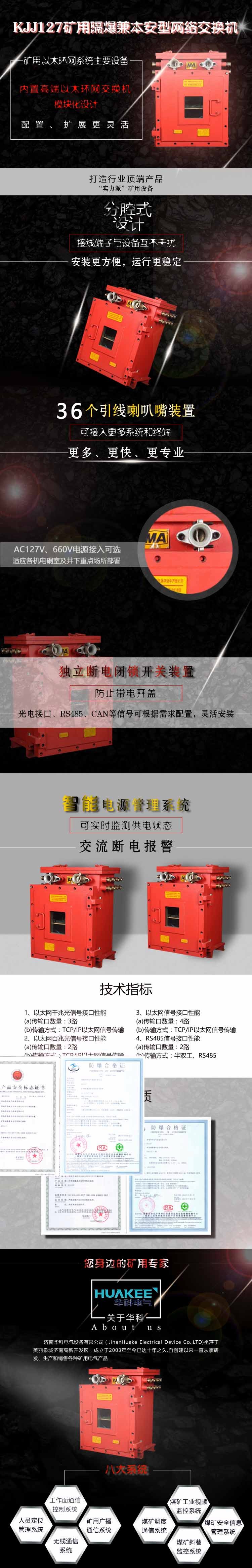 KJJ127(A)矿用隔爆兼本安型万兆环网交换机采用分腔式设计,接线端子与设备互不干扰,设备安装更方便,运行更稳定。36个引线喇叭嘴装置,可以接入更多系统及终端。智能电源管理系统,可实时监测供电状态,交流断电报警电池自维护同时适应各机电室及井下重点场所部署。独立断电闭锁开关装置,防止带电开盖。光电接口、RS485、CAN等信号可配置,灵活安装。采用快开门设计,安装维护更方便。