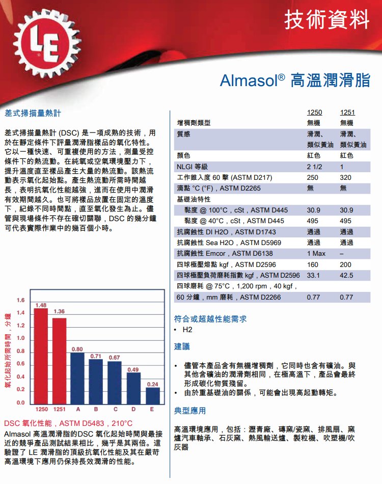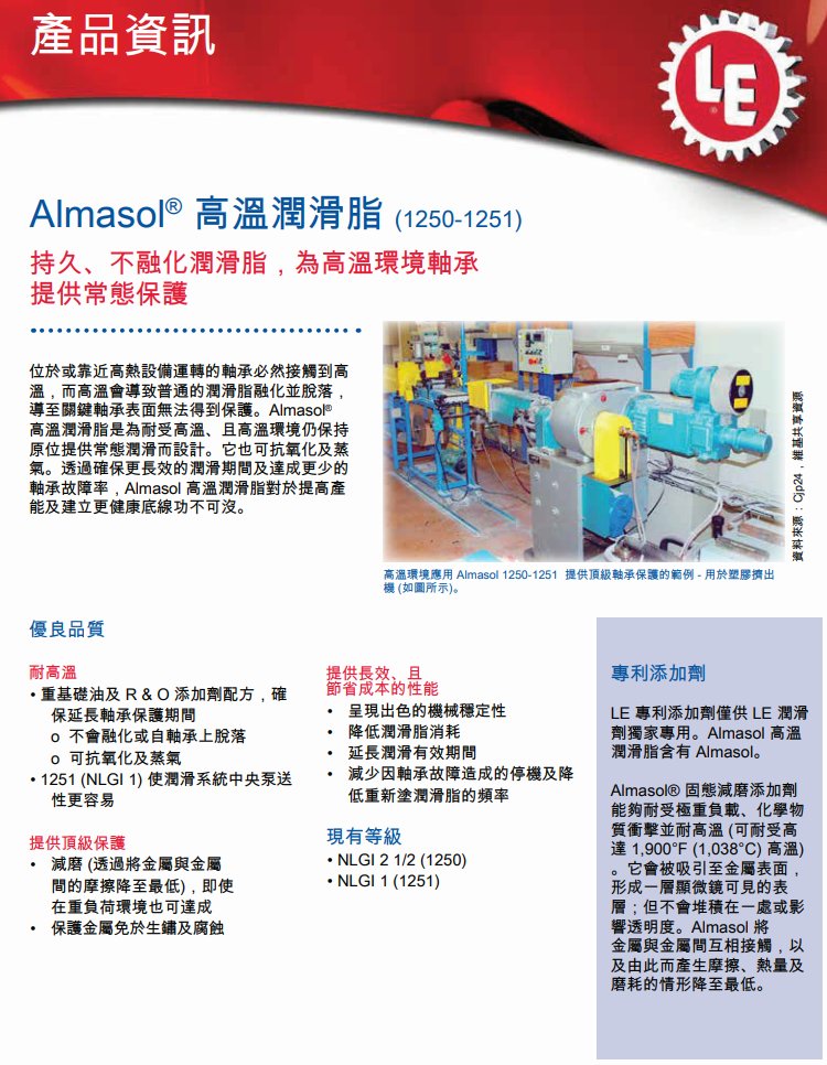 ALMASOL? 涂层加上有效防锈防氧化试剂使1250-1251 能起到防止这种损害,具有全面持久的防护作用。 防止轴承锈蚀。 1250-1251在ASTM 轴承腐蚀测试中名列 1250 的 NLGI 等级为 2 -1/2 1251 的 NLGI 等级为 1 1250-1251为用户提供以下主要益处: ? 延长轴承在高温条件下的使用寿命。不熔原料能确保润滑油定位而不熔化流失,及不会硬化,导致轴承卡死。 ? 延长润滑周期。普通润滑脂随温度升高而熔化流失,需要经常添加润滑脂。使用1250-1251 则无需如此。 ? 降?维修费用。润滑周期延长就意味着润滑脂用量减少,润滑劳动及轴承更换也随之减少。 ? 由于停产更换轴承次数减少,生产相应增加。生产率提高,废品下降。 特 点: 在高温条件下比普通润滑油寿命长。可对一些需用合成剂的设备进行润滑。延长高温轴承寿命。ALMASOL?助剂使油脂具有特殊特性。严酷条件下现场运行表明:使用 ALMASOL?运行温度比使用普通油脂低。?