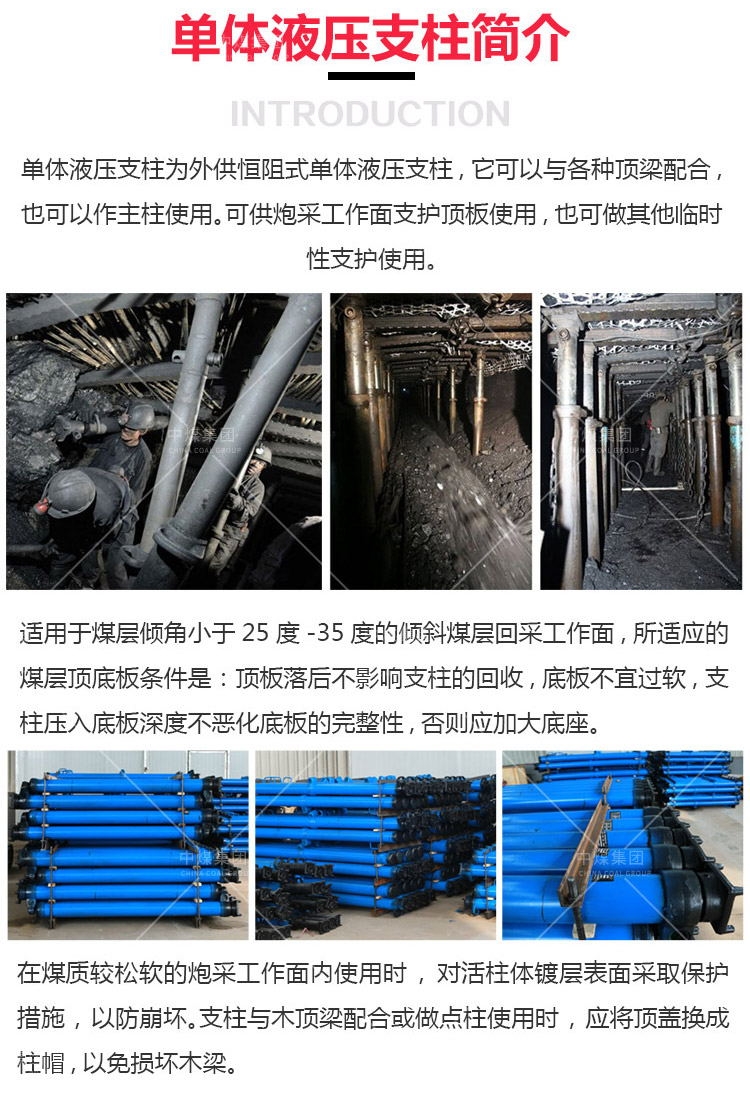 悬浮式单体液压支柱是是一种外部供液的恒阻式单体液压支柱,是机械化普采工作面 的配套设备,也是综采工作面的端头支护设备。其适用于煤矿回采工作面的顶板支护和端头顶板支护,由于其承载能力大、抗偏载能力强、工作行程大、使用范围广,因而其可应用于薄煤层、中厚煤层及 较厚煤层工作面。