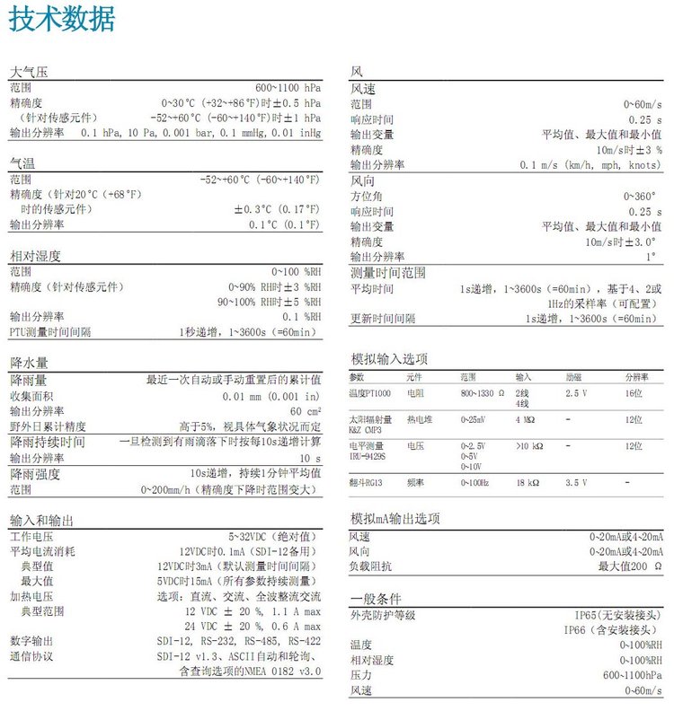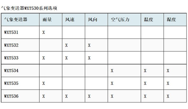 | WXT536 | 风速 风向 温度 湿度 气压 雨量 | ||