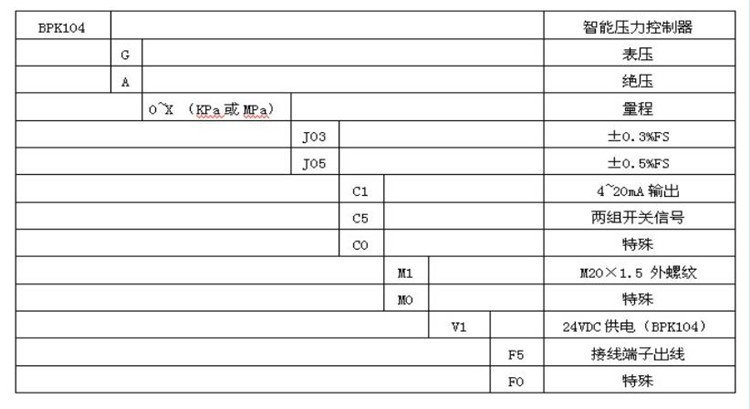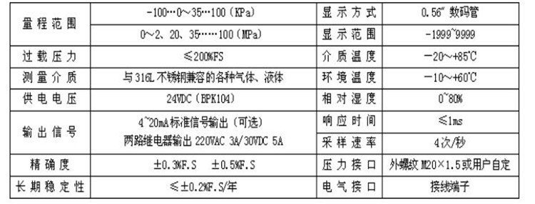 ??BPK104系列智能压力控制器是集压力测量、显示、输出、控制于一体的压力测控产品。该产品为全电子结构,前端采用隔离膜充油芯体,由高精度的A/D转换,经微处理器运算处理,现场显示,并输出一路模拟量和两路开关量。该智能压力控制器使用灵活,操作简单,调试容易,安全可靠。广泛应用于水电,自来水,石油,化工,机械,液压等行业,对流体介质的压力进行现场测量、显示与控制。