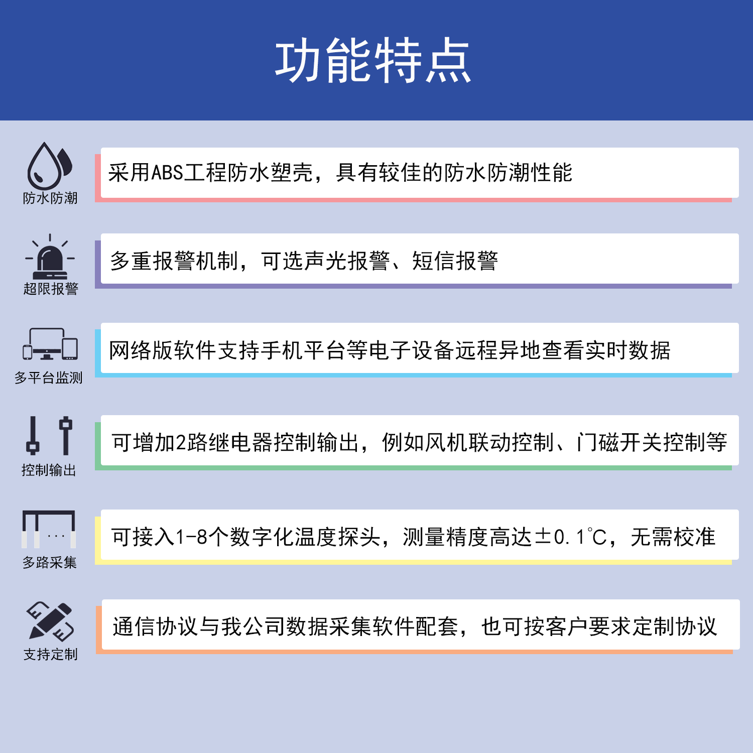 | 外接探头 | 可接入1-8个数字化RW1820/DS18B20型号温度探头 | ||