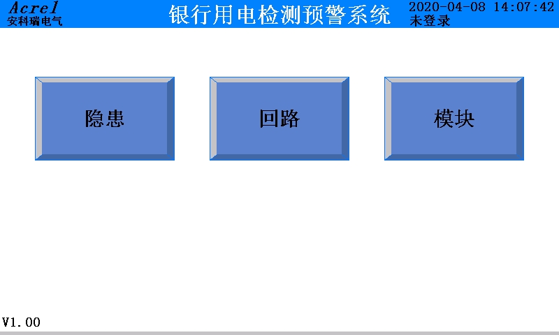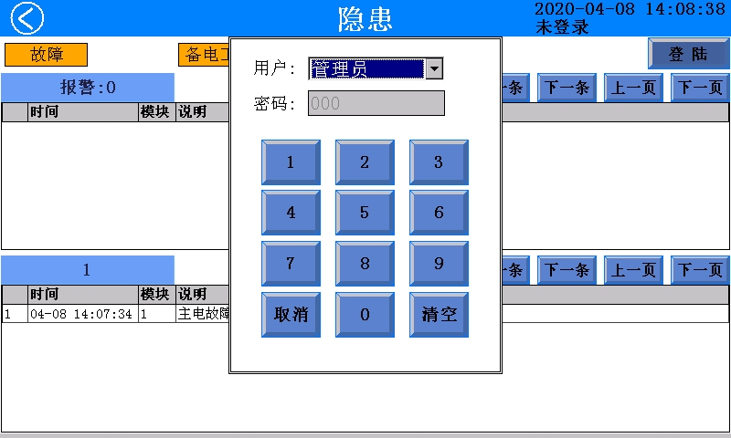 设备上电后,监控软件自动运行,显示屏显示程序未登录状态下的主页面此时软件已经准备就绪,等待用户登录。