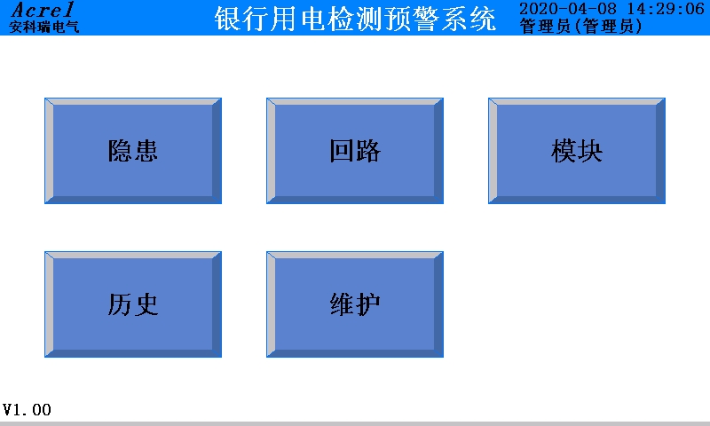 点击左上角的 < 按钮,回到系统的首页面,该页面共有5个按钮(隐患、回路、模块、历史、维护),可以分别进入5个不同的页面,如图8。