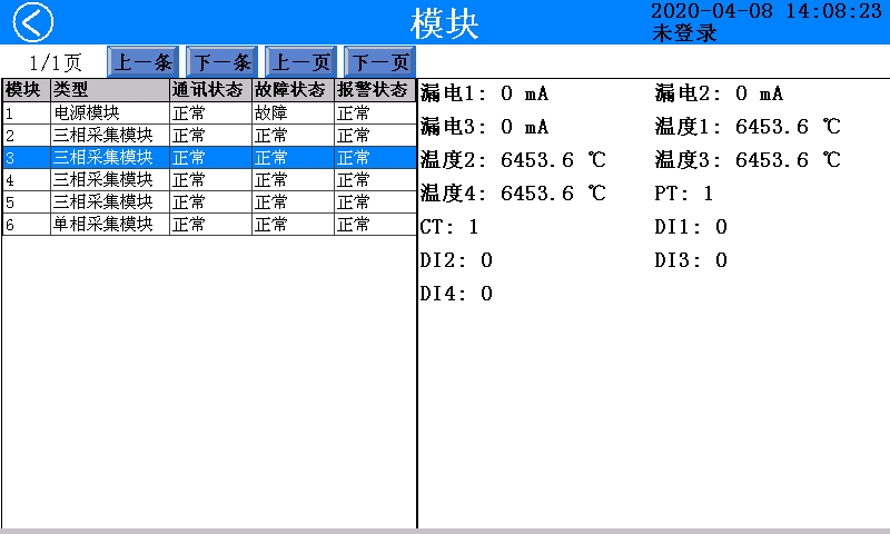 列表页面以列表的方式显示系统所有模块链接到主机的采集数据以及状态。列表中的每一行代表一个模块,每一列代表某个模块的一个属性。点击任何一行可以选中一个模块,此时,该模块的详细信息会显示在页面右部。同样可以双击某一行,即可查看该行所代表的模块的详细信息。