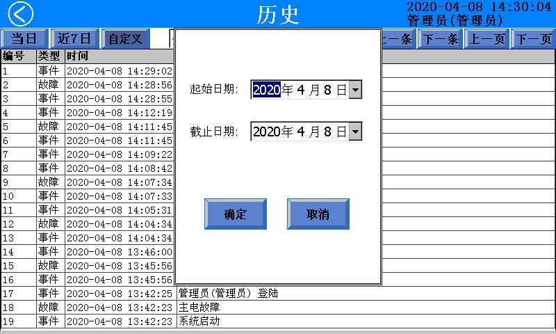在该页面内可查询任意时段内的报警、故障、事件记录。点击“当日”按钮查询当日所有记录,点击“近7天”按钮查询近7天所有记录。点击“自定义”按钮可以选择时间范围再进行查询,如图所示。