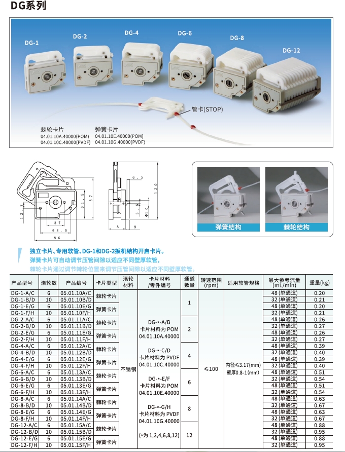 DG系列微量多通道型蠕动泵泵头为独立卡片、专用软管;DG-1和DG-2扳机结构开启卡片。压管间隙可微调,适应不同壁厚软管。是为小流量、多通道流体输送而设计,易于更换和固定软管。滚轮均采用优质材料。泵头由本体、滚轮装置和便于装卸的卡片构成。