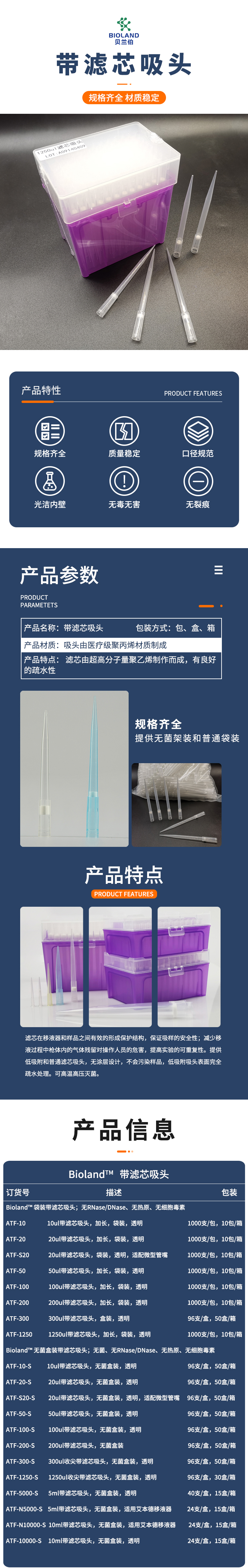 吸头由医疗级聚丙烯材质制成,滤芯由超高分子量聚乙烯制作而成,有良好的疏水性。滤芯在移液器和样品之间有效的形成保护结构,