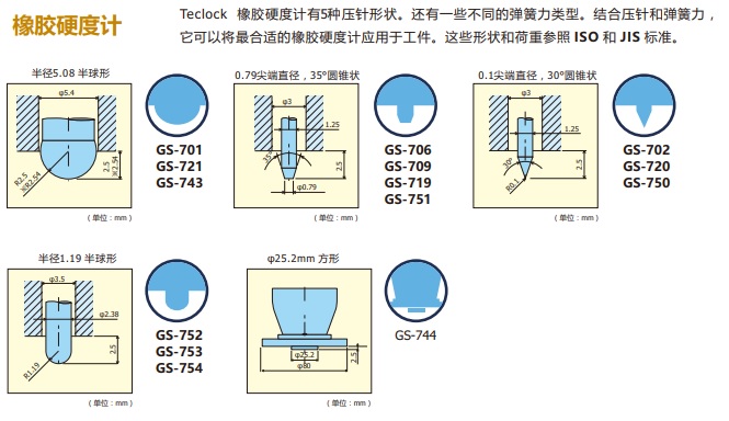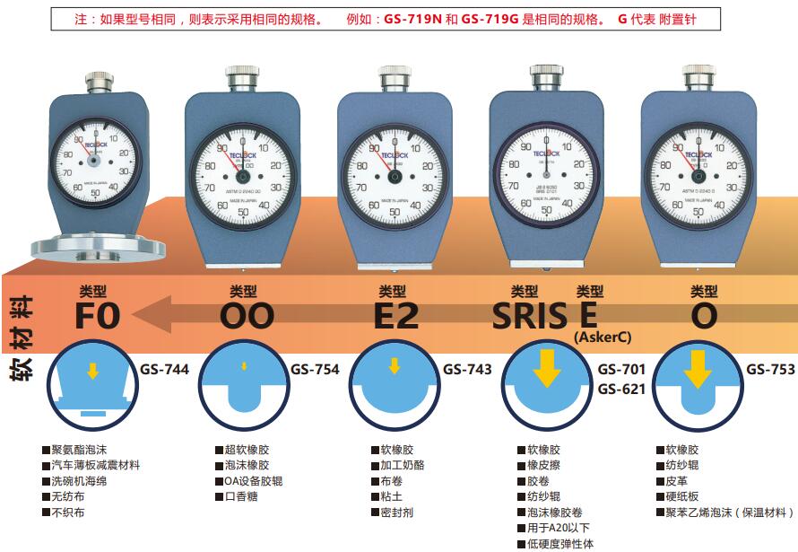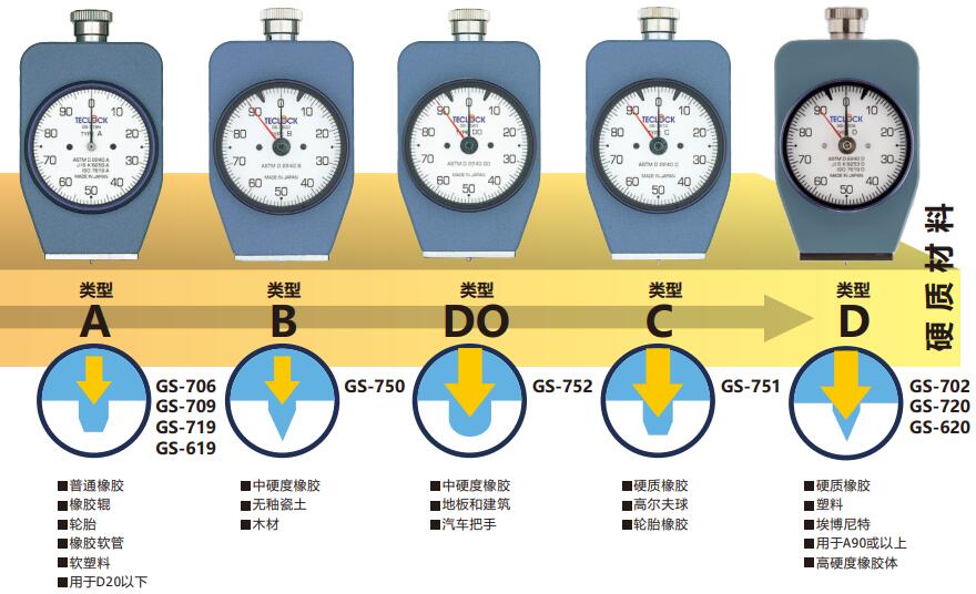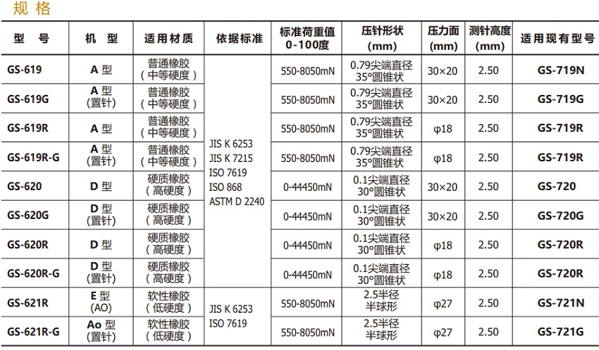 弹簧力、压针大小及形状,有许多类型的橡胶硬度计。这是根据国际标准,为了对橡胶材质的几种形状和材料特性有最精确的测量结果。Teclock橡胶硬度计符合国际标准,也有自己的标准来测量各种材料。请参考下表选择最合适的型号。