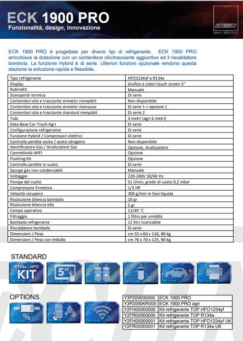 ECK 1900 PRO 专为不同类型的制冷剂而设计。 ECK 1900 PRO 通过额外的油/示踪剂容器和钢瓶加热器丰富了设备。混合功能是标准功能。附加的可选功能使该站成为快速灵活的解决方案。