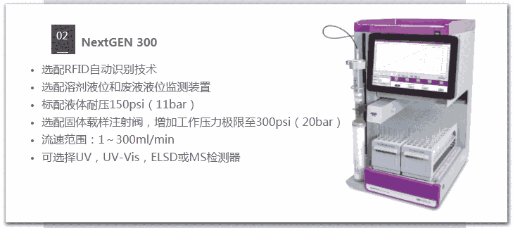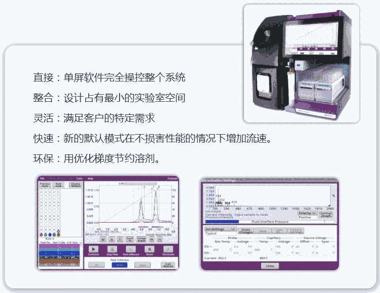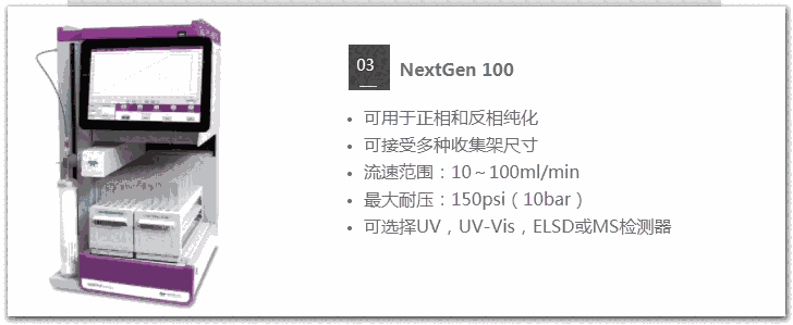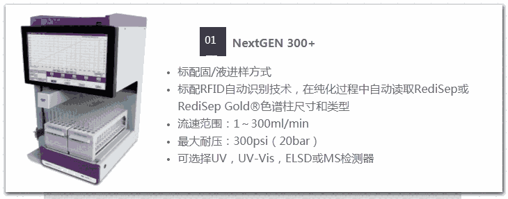 CombiFlash? NextGEN系列产品可从制备纯化过程中进行自动识别色谱尺寸和类型,提高制备实验效率,无论是在提纯合成化合物、天然产品、肽或聚合物。直观的PeakTrak软件可在数秒内开始分离。根据要纯化的样品的类型和数量选择正相或反相柱,允许RFID标签载入运行参数,确认检测器设置(UV, Vis, ELS和MS),按下开始,载入样品,即可开始自动工作,无需人员值守。实验进行时随时更改参数?当分离实验开始时,依然可以修改参数,包括溶剂百分比、波长、流速和运行时间等,不需要进行重复分离。