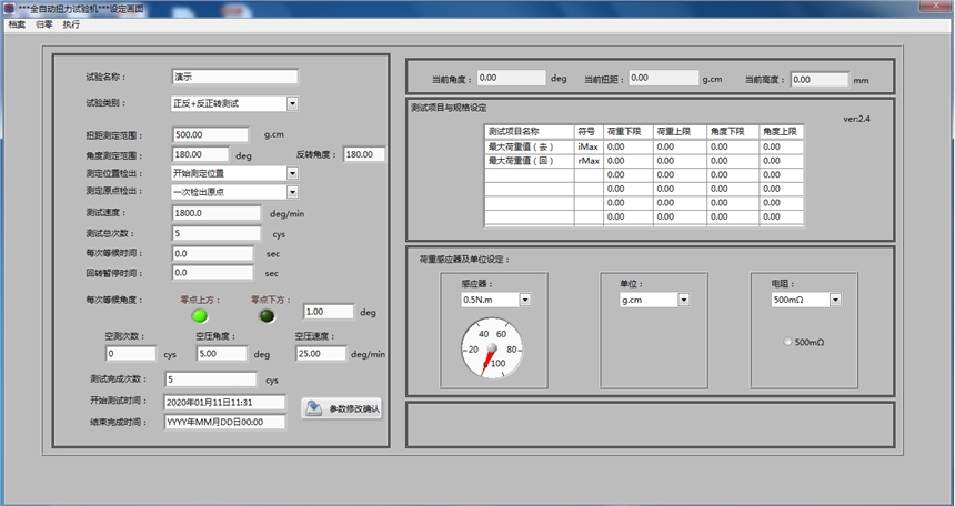 *由下拉式选单勾选设定或直接输入数据。(含测定力量种类、测定走行方向、荷重测定范围、角度测定范围、行程原点位置、行程原点检出、测定速度、测定次数、暂停时间、每次等候位置)