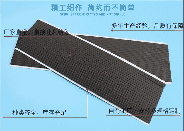常用的泡棉为eva(橡塑发泡,耐温在80度左右。颜色齐全,硬度多种,分别是25度高弹,38度、45度、60度、70度。手感光滑细腻,可定制防火阻燃以及防静电功能)以及EPDM(三元乙丙发泡,分为开孔以及闭孔。开孔硬度从0度至10度,表面粗糙;闭孔硬度从10度至40度之间,手感柔和,弹性较好,表面光滑但是摩擦系数较高,耐温在150度左右)