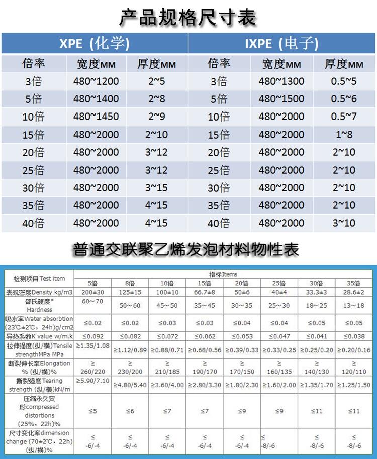 IXPE(电子交联)全称电子辐射交联聚乙烯发泡材料,是以聚乙烯为主要原材料,配以其它几种不含任何有害物质的辅料先经混合挤塑成型,通过绿色健康辐照加工技术,利用电离子辐射作用于物质产生的交联改变基料原有的结构,形成网状独立闭孔泡孔结构,生产出的高科技高档闭孔泡沫材料。此类产品具有外观光滑,手感舒适,加工性能好等优点。其泡孔细密均匀,强韧且有绕性,隔音、隔热、保温效果优异,吸水性小,回弹性、耐候性、耐老化、防霉变和耐各种化学制剂腐蚀性强等符合国际环保标准的功能性材料。发泡倍数:3--40倍;宽度:600-2000MM宽以内厚度:单层0.1-15MM ,也可复合成0.1-100MM厚不等,常用颜色:黑色、白色、灰色、彩色等。