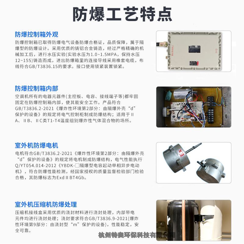5、 防爆措施:空调机内的电器元件、电气控制部分及风扇电机均采取专用的防爆结构处理(隔爆型), 电磁阀、压缩机出线及高低压压力开关采用浇封型,操作面板及管温、环温传感器等均采用其独有的本质安全型,防爆要点可靠突出。6,防爆空调产品概述:产品具有制冷制热和自动除霜功能,压缩机、风机等都经过特殊的防爆处理,防爆类型为整机防爆。防爆产品可应用于石油、化工、医药、科研、军事、危险仓库等易燃易爆的混合性气体环境中使用。在结构上采用隔爆型、本安型、浇封型等复合防爆技术,控制端全由本安型控制,不产生任何电火花,使用方便安全,采用高效多翅式换热器,冷煤通过时与空气的接触更充分,能大幅度的提高空调的制冷制热效果。