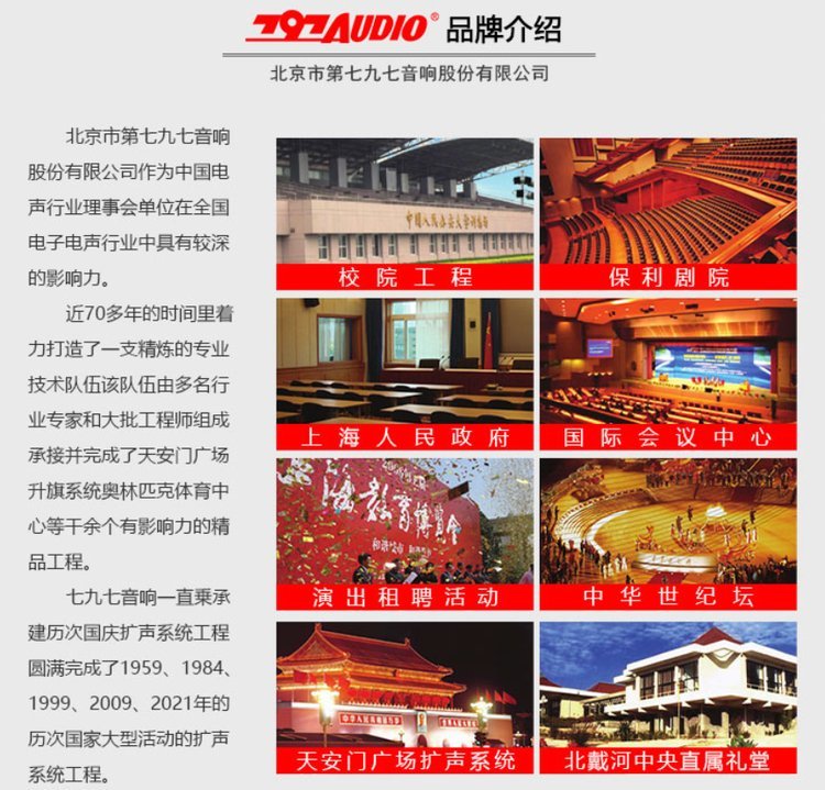北京第七九七音响股份有限公司创始于1953年,原名国营第七九七厂,中国电子元件行业协会电声分会副理事长单位,是一家集研发、生产、销售、售后服务、维护保障、智能化工程为一体的高新技术企业。