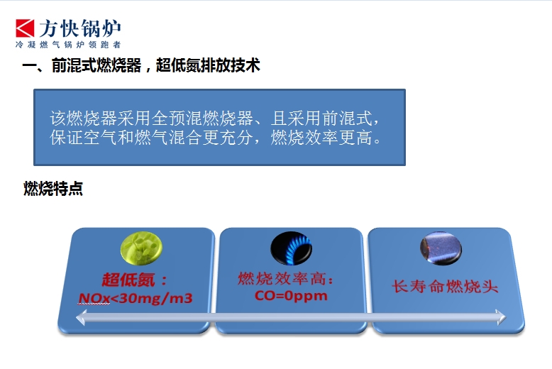 该燃烧器采用全预混燃烧器、且采用前混式,保证空气和燃气混合更充分,燃烧效率更高