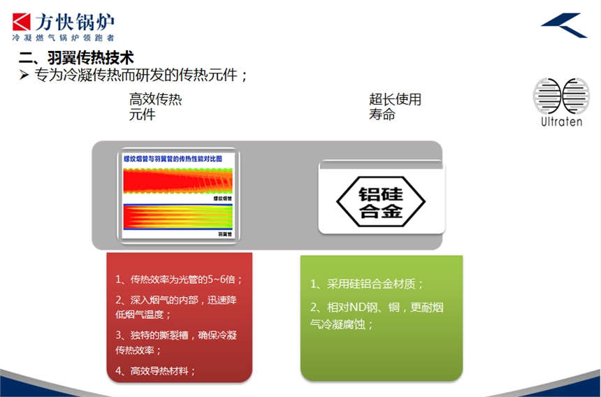 本炉型为完全冷凝热水锅炉,燃烧器采用前混式全预混燃烧器,提高炉膛容积热负荷,降低高温型NOx的生成。受热面采用方快自主研发的Ultraten技术,极大降低锅炉排烟温度。提升烟气冷凝率,锅炉效率大幅度提升。