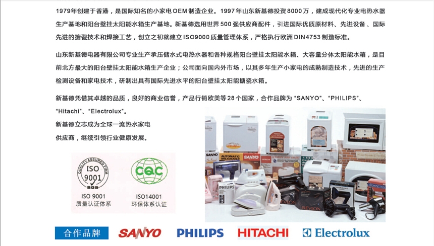 ? 1997年山东新基德投资8000万,建成现代化专业电热水器生产基地,创立了新基德热水器的搪瓷标准和焊接工艺,并成为早期的实力品牌。新基德热水器选用世界500强供应商,引进国际优质原材料和先进设备,从开始建立ISO9000质量管理体系,到严格执行欧洲DIN4753制造标准,制造工艺精益求精。在市场开拓方面,产品销往全国二十九个省市和自治区,并为国内知名品牌提供ODM/OEM产品加工。新基德立志成为全球一流热水家电供应商,将以登顶产销1亿台为新起点,继续引领行业健康发展。