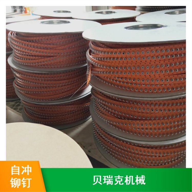 料带式自冲铆钉是为了配合手持式自冲铆接机上料而设计的,料带上安装有铆钉,通过料带的移动,铆钉逐颗送到自冲铆接机枪室,从而完成铆接自动化的过程。