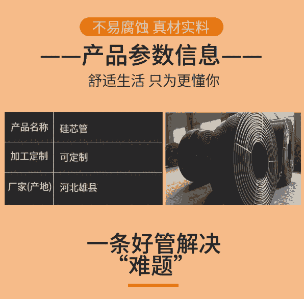 硅芯管 其内壁的硅芯层是被同步挤压进高密度聚乙烯管道壁内,且均匀地分布整个管道内壁,不会剥落,脱离,与硅管同寿命;