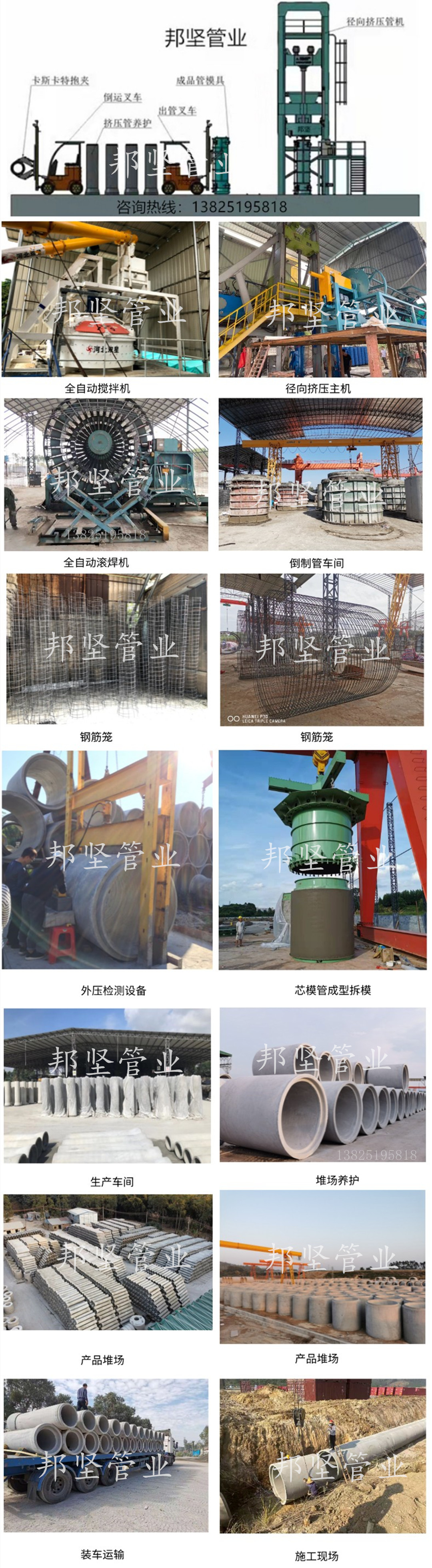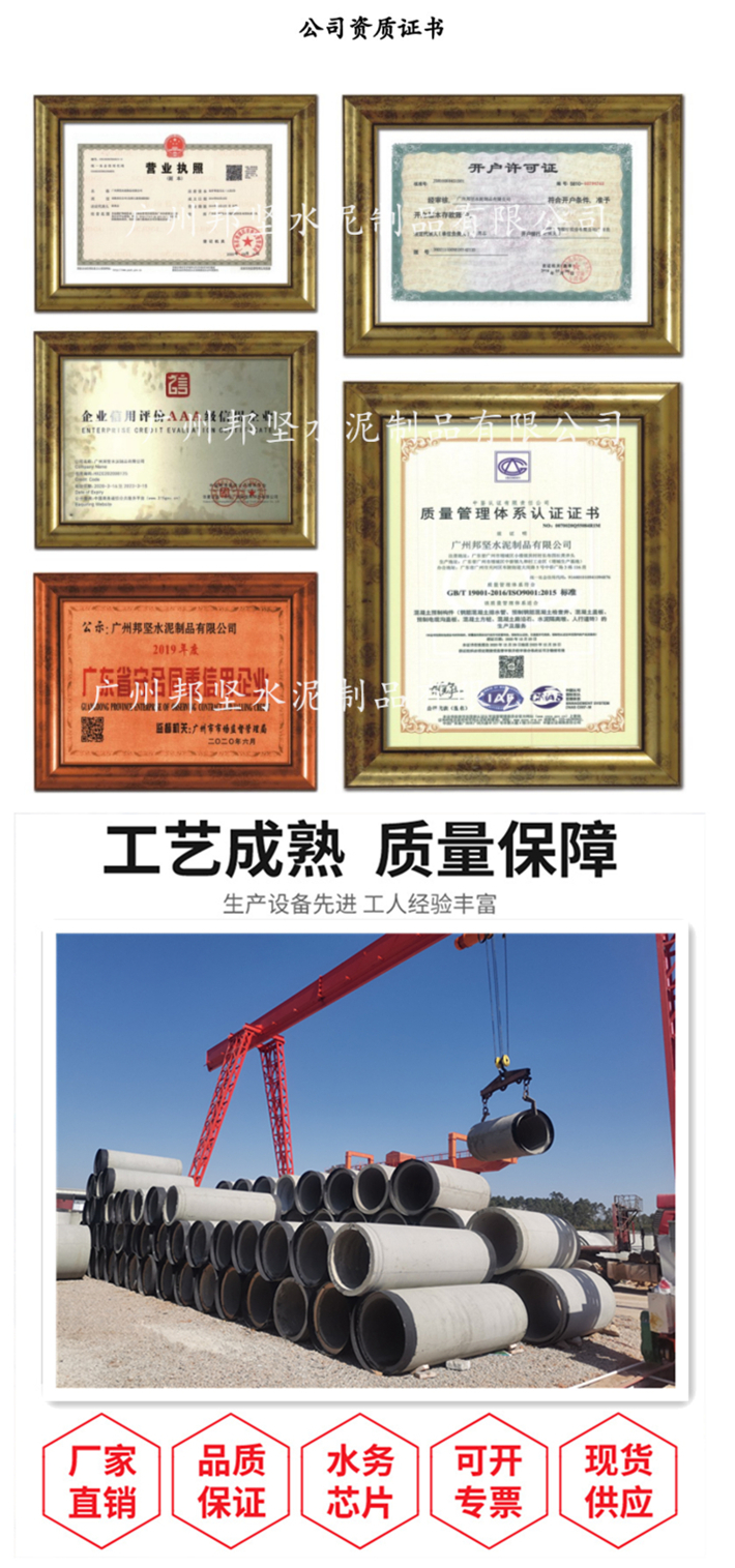 邦坚管业专业生产、销售:钢筋混凝土排水管、三级F型顶管、装配式混凝土检查井、矩形检查井、雨水口、电力顶管、电缆沟盖板、河道生态砌块、混凝土方桩、混凝土化粪池、路缘石等产品。