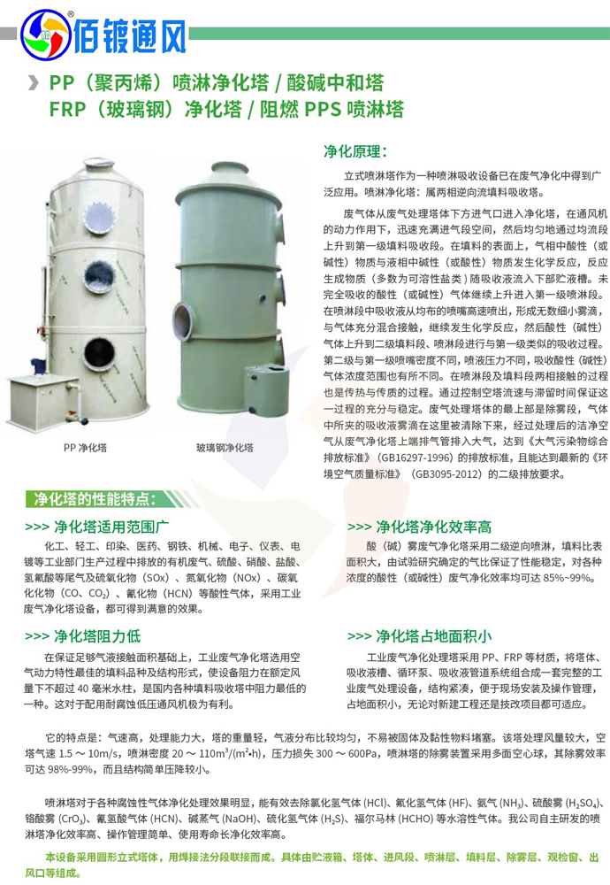 废气体从废气处理塔体下方进气口进入净化塔,在通风机的动力作用下,迅速充满进气段空间,然后均匀地通过均流段上升到第一级填料吸收段。在填料的表面上,气相中酸性(或碱性)物质与液相中碱性(或酸性)物质发生化学反应,反应生成物质(多为可溶性盐类)随吸收液流入下部贮液槽。未完全吸收的酸性(或碱性)气体继续上升进入第一级喷淋段。在喷淋段中吸收液从均布的喷嘴高速喷出,形成无数细小雾滴,与气体充分混合接触,继续发生化学反应,然后酸性(碱性)气体上升到二级填料段、喷淋段进行与第一级类似的吸收过程。第二级与第一级喷嘴密度不同,喷液压力不同,吸收酸性(碱性)气体浓度范围也有所不同。在喷淋段及填料段两相接触的过程也是传热与传质的过程。通过控制空塔流速与滞留时间保证这一过程的充分与稳定。废气处理塔体的最上部是除雾段,气体中所夹的吸收液雾滴在这里被清除下来,经过处理后的洁净空气从废气净化塔上端排气管排入大气,达到《大气污染物综合排放标准》(GB16297-1996)的排放标准,且能达到最新的《环境空气质量标准》(GB3095-2012)的二级排放要求。