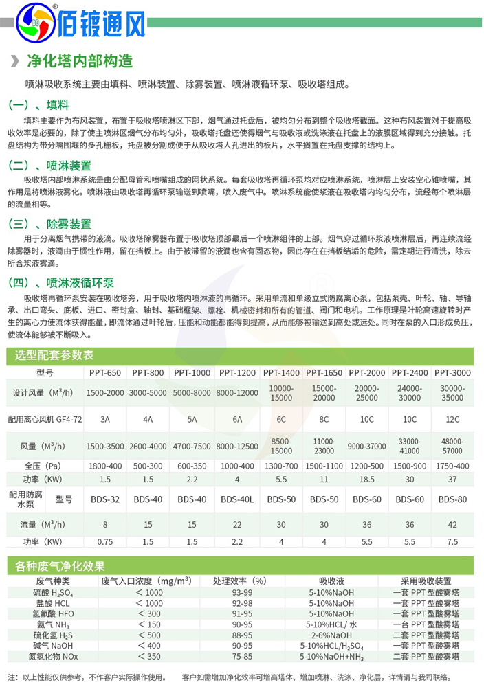 2、净化塔净化效率高:酸(碱)雾废气净化塔采用二级逆向喷淋,填料比表面积大,由试验研究确定的气比保证了性能稳定,对各种浓度的酸性(或碱性)废气净化效率均可达