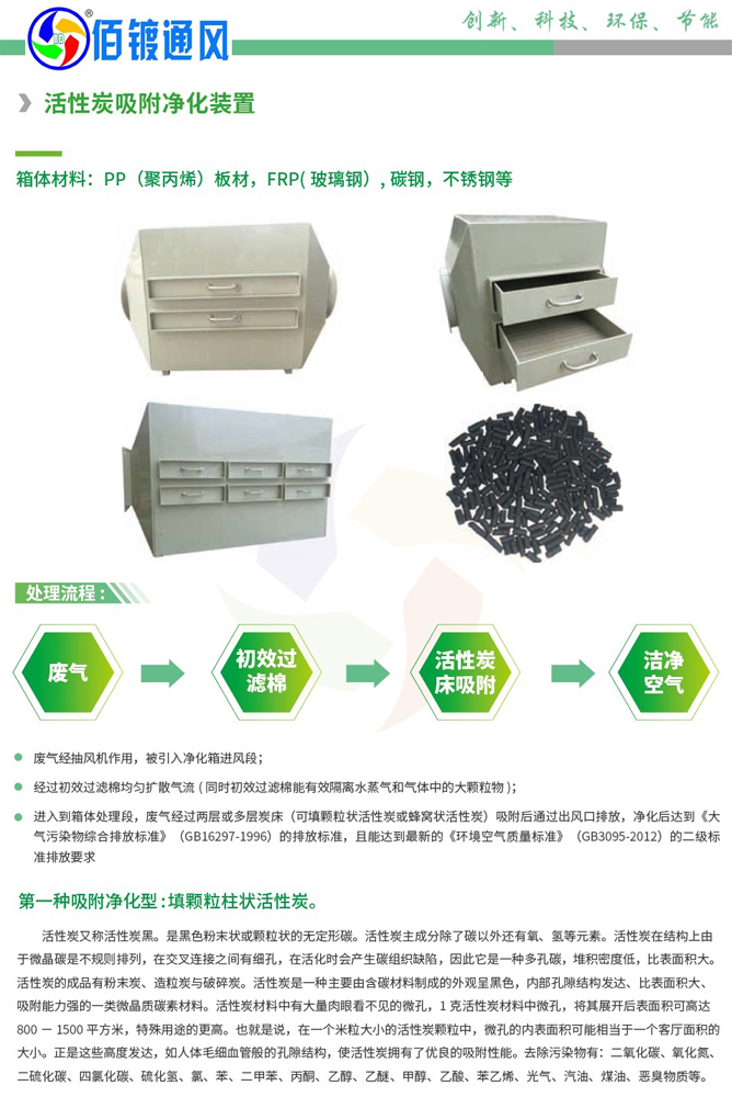 利用活性炭多微孔的吸附特性吸附有机废气是一种最有效的工业处理手段。使用特殊成型的蜂窝状活性炭作为吸附材料是利用活性碳多微孔的吸附特性。活性炭是许多具有吸附性能的碳基物质的总称,其经过活化处理后,比表面积一般可达700-1000m2/g,具有优异和广泛的吸附能力。活性炭还是一种非极性吸附剂,具有疏水性和亲有机物的性质,它能吸附绝大部分有机气体,如苯类、醛酮类、醇类、烃类等以及恶臭物质。同时由于活性炭的孔径范围宽,即使对一些极性吸附质和一些特大分子的有机物质仍表现出它优良的吸附能力,如在SO2、NOX、Cl2、H2S、CO2等有害气体的治理中。我公司选用的优质蜂窝状活性炭具有性能稳定、抗腐蚀和耐高速气流冲击的优点,用其对有机废气进行吸附可使净化效率高达90%。由于活性炭具有饱和性,需定期更换。有机废气和臭味(苯类、酚类、醇类、醚类、酊类)活性炭吸附箱对于浓度低于1000mg/m3的废气净化后达到《大气污染物综合排放标准》(GB16297-1996)的排放标准,且能达到最新的《环境空气质量标准》(GB3095-2012)的二级标准排放要求。