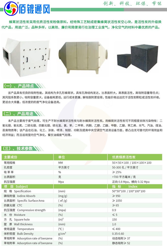 该产品具有优良的吸附性能,其结构为多孔形蜂窝状,具有孔隙结构发达,比表面积大,高表面活性,高吸附容量等优点;其风阻系数更小,吸附容量更大,设备能耗更低,运行成本更廉,解吸脱附更容易,性能价格远远优于活性炭颗粒或活性炭纤维,更适合大排量,低浓度的的废气净化设备选用。