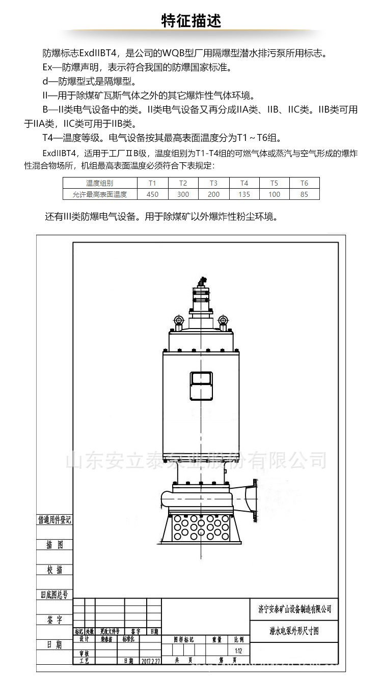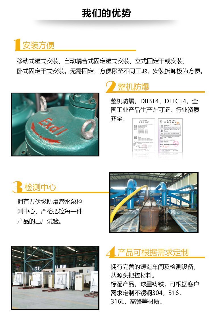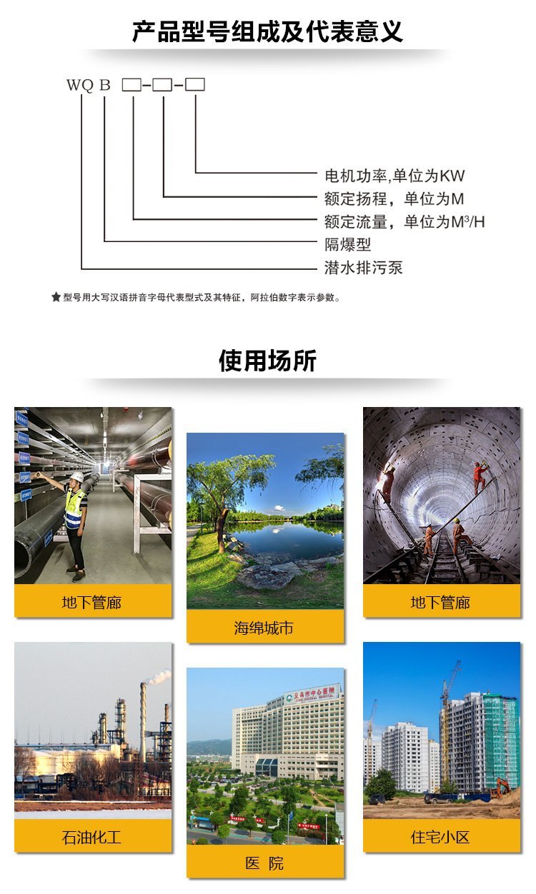 产品用于工厂ⅡB级,温度组别为T1-T4组的可燃气体或蒸汽与空气形成的性混合物场所的污水排放。适用于煤化工、石油化工、市政工程、城市工业、宾馆、住宅小区等场所。