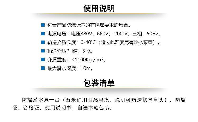 ?防爆潜水泵一台(五米矿用阻燃电缆、如有需要可赠送软管弯头)、防爆证、煤安证、合格证、使用说明书。