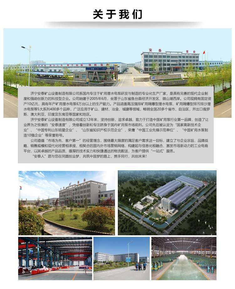 安立泰集团成立于2005年6月,占地面积300余亩,员工500余人,集团公司固定资产达到10亿余元,是一家集矿用机电装备制造、耐磨合金铸造、工程/建筑机械、科技研发和销售服务于一体的股份制企业。通过近几年公司的资源整合后现集团公司旗下设有两家全资子公司与一家合资公司——山东安立泰泵业股份有限公司(科技版挂牌企业,股票代码:171009)、济宁安泰矿山设备制造有限公司,合资公司——山东安特威尔东方新材料有限公司;集团公司主营产品有:矿用潜水泵、市政工程排污泵、工程机械、建筑机械、防爆电器、耐磨辊圈、球磨机自磨机半自磨机耐磨材料等。