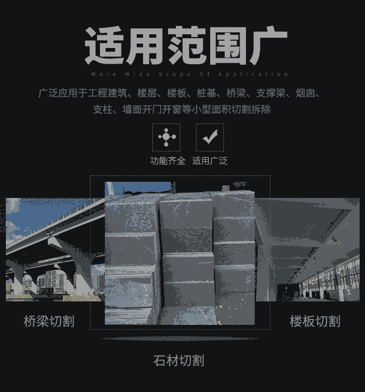 2.工程建筑的切割。切割的作业主要用于桥梁的切割拆除,以及楼房建筑、平房建筑、厂房建筑的切割和改造,以及道路施工的该做。