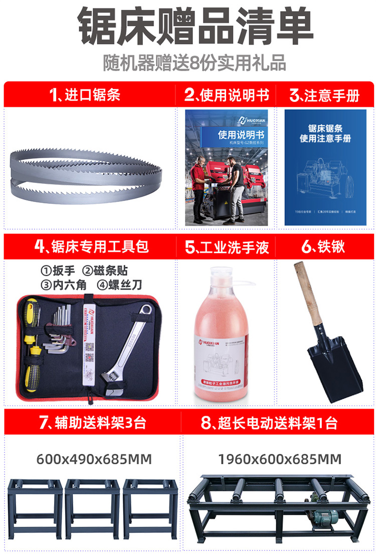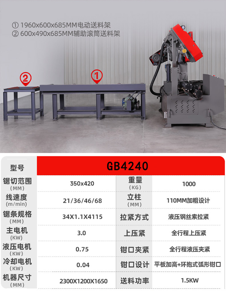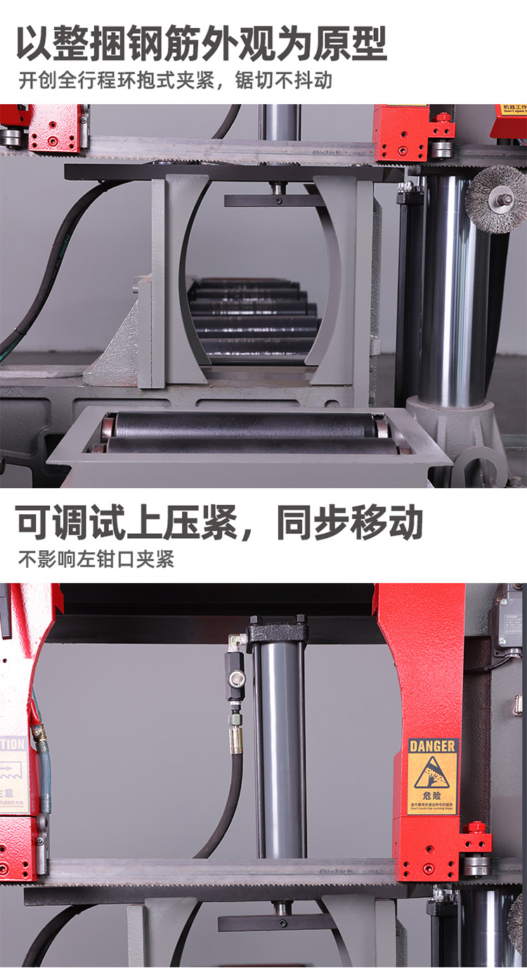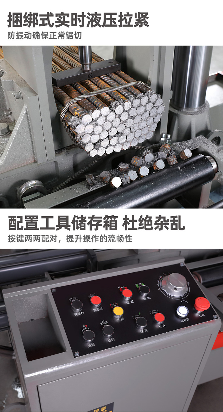 设备性能特点: 本机床可锯切各种黑色金属和有色金属。双立柱结构,保证导向精度,锯削可靠.清屑装置,有效清理锯齿间铁屑,保 护锯带使用寿命.液压钳口,方便夹持物料,适合模具材料切割。锯床传动机构精密平衡校正,振动确保锯 带不易断齿、拉齿。 钢筋带锯床 数控液压切整捆钢筋带锯床 双立柱工字钢切割锯床。