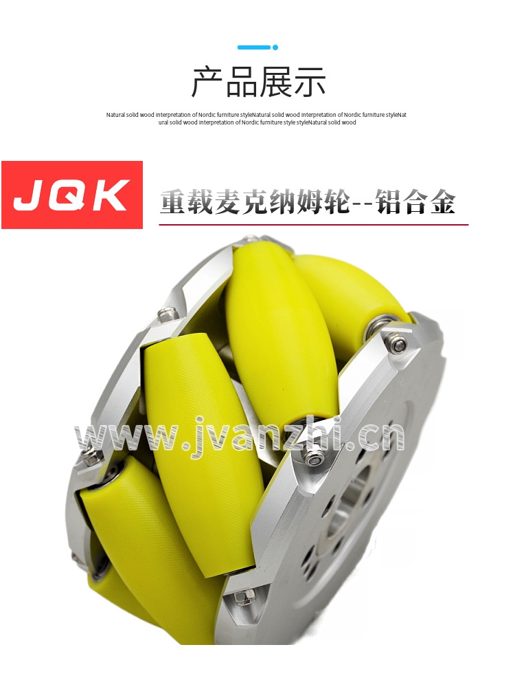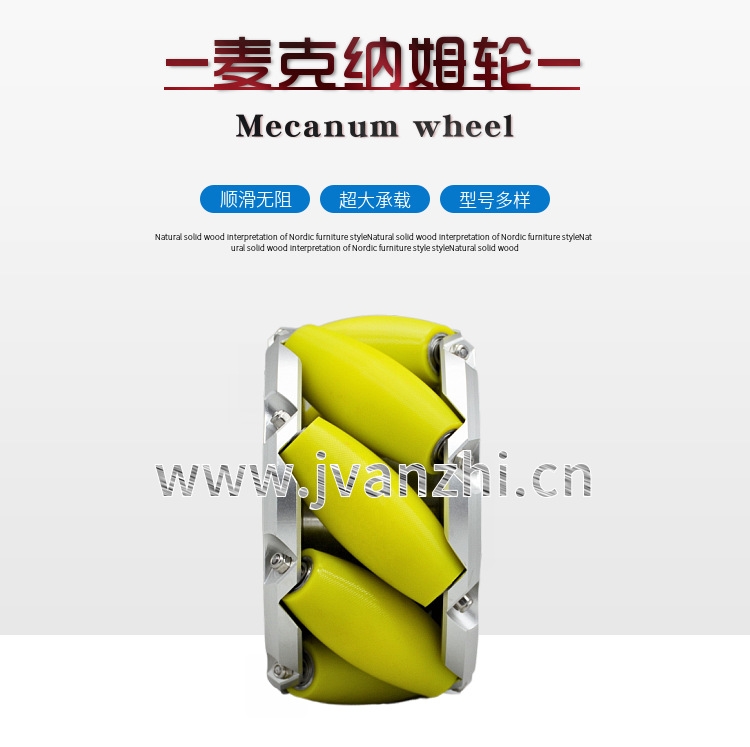 麦克纳姆轮采用新型聚氨酯包胶轮子进行组合,定制轮子设计,适应多种重量,可以更灵活方便的实现全方位移动功能。麦克纳姆轮轮毂材质为铝合金/碳钢,脚轮材质为进口高耐磨聚氨酯。