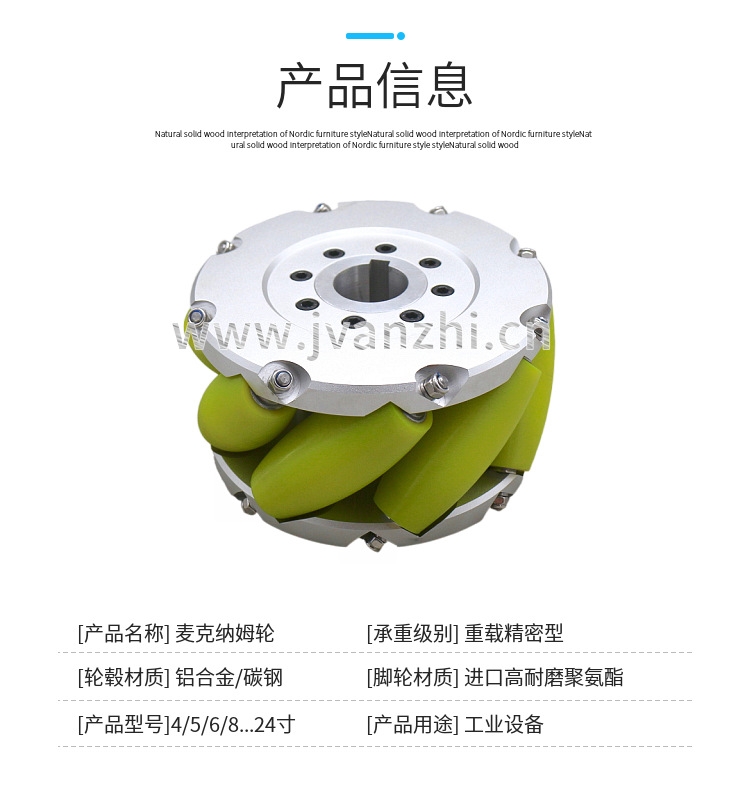 麦克纳姆轮轮毂材质为铝合金/碳钢,脚轮材质为进口高耐磨聚氨酯。
