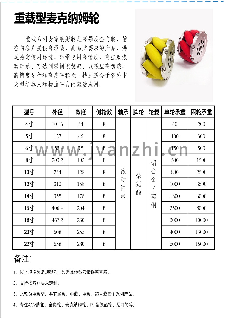 麦克纳姆轮分为轻载,中载,重载,超重载四个系列产品。