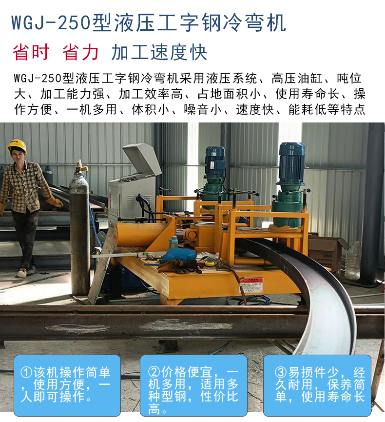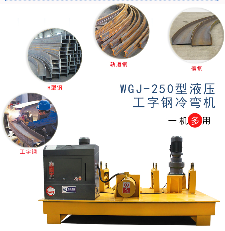 我厂主营的型号有:250型、220型、300型、320型等型号,操作简单,一机多用,适用于工字钢、H型钢、槽钢、方钢等钢材的冷弯加工,工字钢顶弯机 全自动数控工字钢冷弯机 小半径隧洞冷弯机需要接三相电,整机瓜式操作,容易上手,一人操作即可。