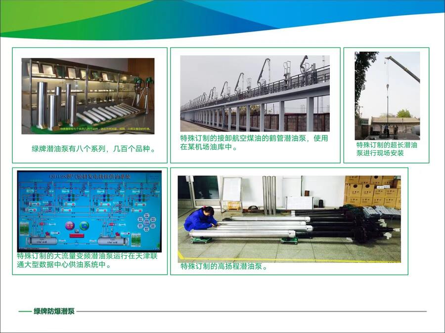 绿牌潜泵机泵一体防爆设计,电机在液面下运行,正压推送,管道处于正压工作状态,没有气化条件,不产生气阻现象,设备终身免维护,节能省电。