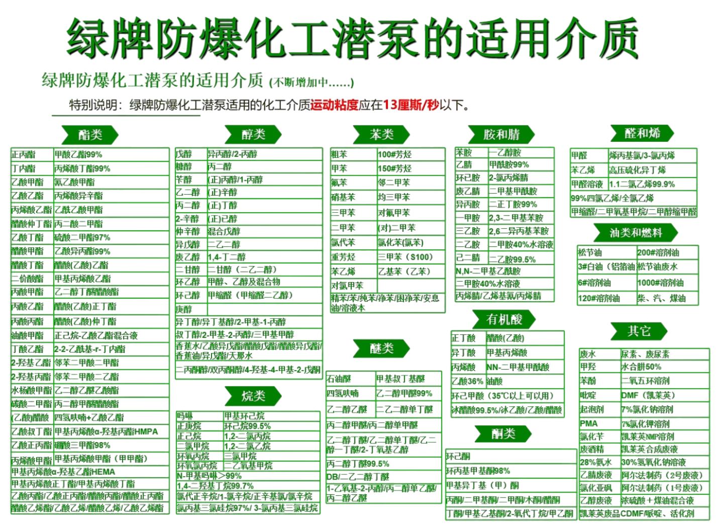 绿牌潜泵分为八个系列(数百种型号),有标准系列、大流量系列、高扬程系列、变频系列、槽车鹤管系列、化工系列、自适应系列和超大流量系列。
