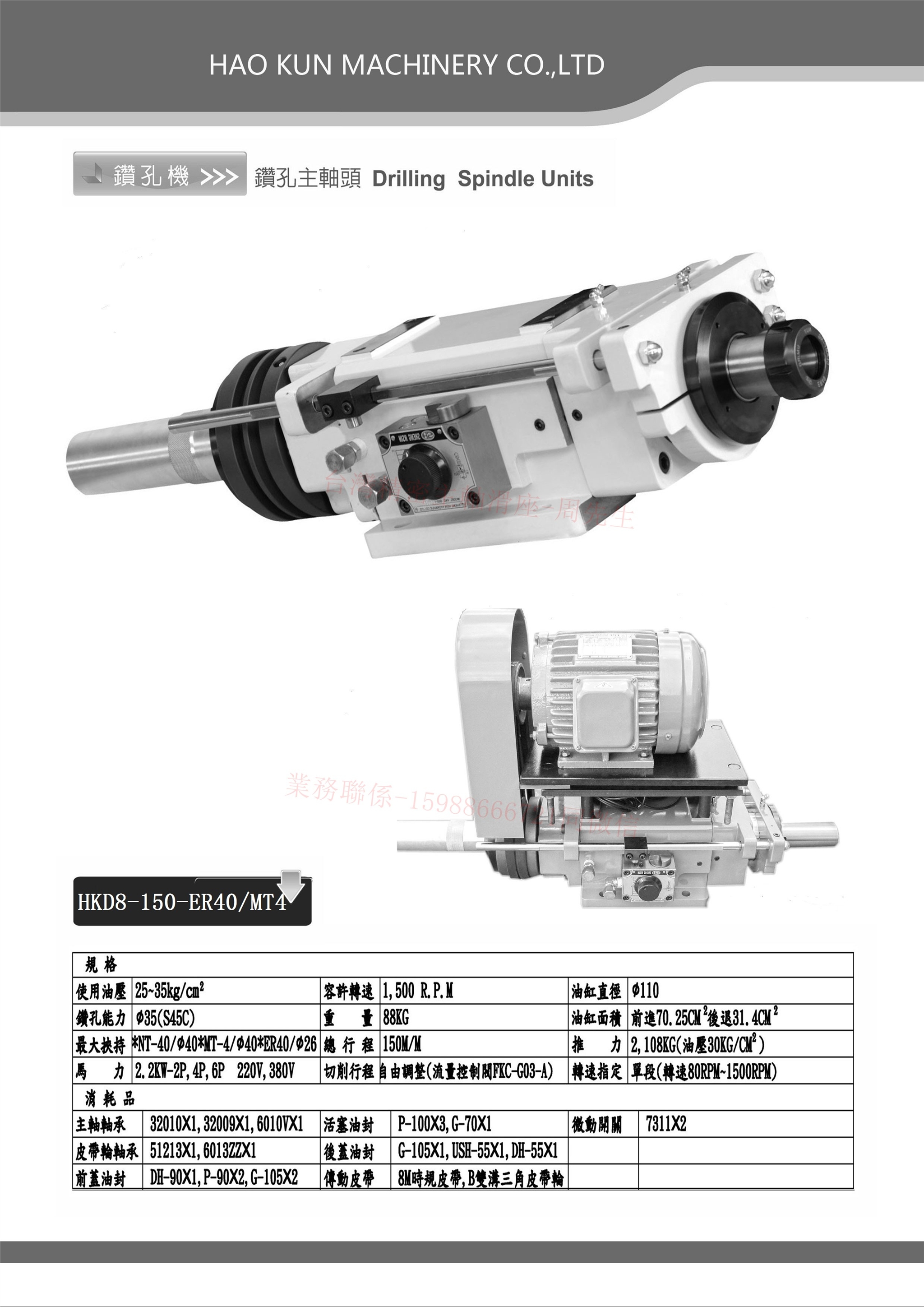 HKD8-150油压(钻孔能力為(S45C) ∮35mm,主轴转速為RPM1500,主轴X行程為150mm,马力為5HP*2P/4P/6P,鼻端输出方式為NT40/AS32/MT4/ER40,重量為90Kg).