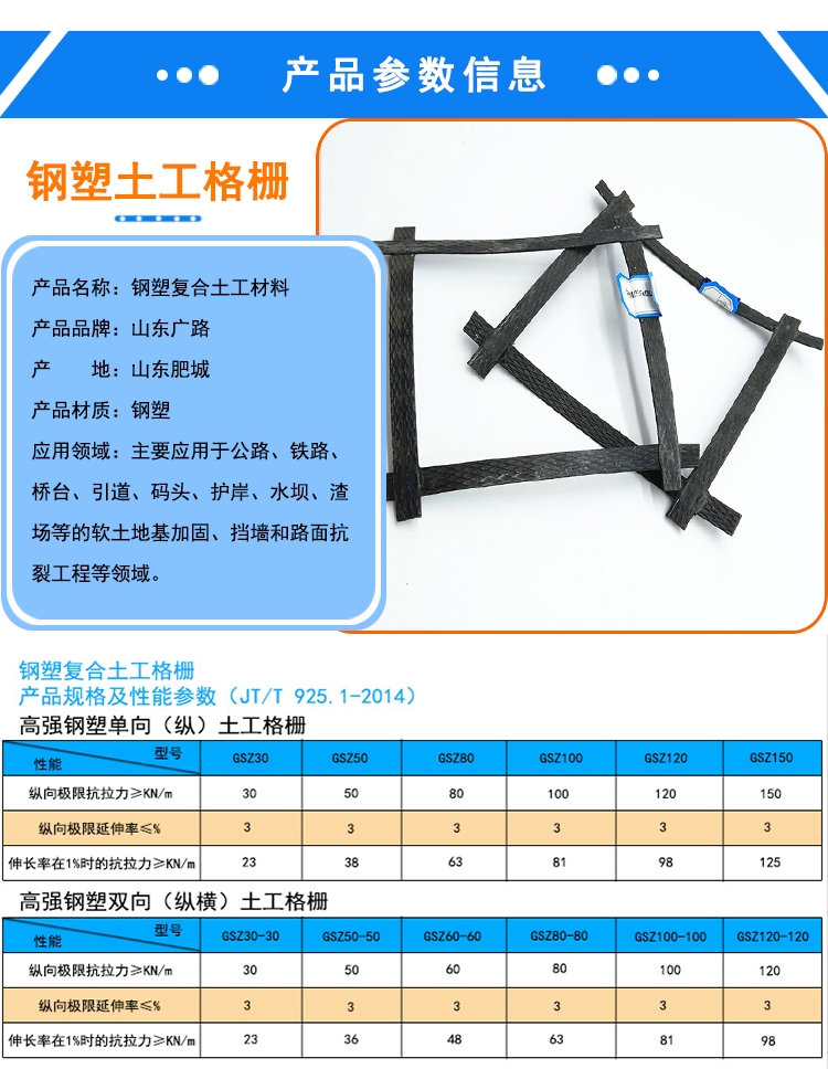 钢塑复合土工格栅 产品介绍 此产品以高强钢丝(或其他纤维),经特殊处理,与聚乙烯(PE),并添加其他助剂,通过挤出使之成为复合型高强抗拉条带,且表面有粗糙压纹,则为高强加筋土工带。由此单带,经纵、横一定间距纺织或夹合排列,采用特殊强化粘接的熔焊技术焊接其交接点而成型,则为加筋土工格栅。 产品特点 1、强度高、变形小 2、蠕变小 3、耐腐蚀、寿命长,钢塑土工格栅以塑料材料为保护层,再辅以各种助剂使其具有抗老化、氧化性能,可耐酸、碱、盐等恶劣环境的腐蚀。因此,钢塑土工格栅可以满足各类永久性工程100年以上的使用需求,且性能优、尺寸稳定性好。 4、施工方便快捷、周期短、成本低,钢塑土工格栅铺设、搭接、定位容易、平整、避免了重叠交叉,可有效地缩短工程周期,节约工程造价的10%-50%。 产品用途 主要应用于公路、铁路、桥台、引道、码头、护岸、水坝、渣场等的软土地基加固、挡墙和路面抗裂工程等领域。 |