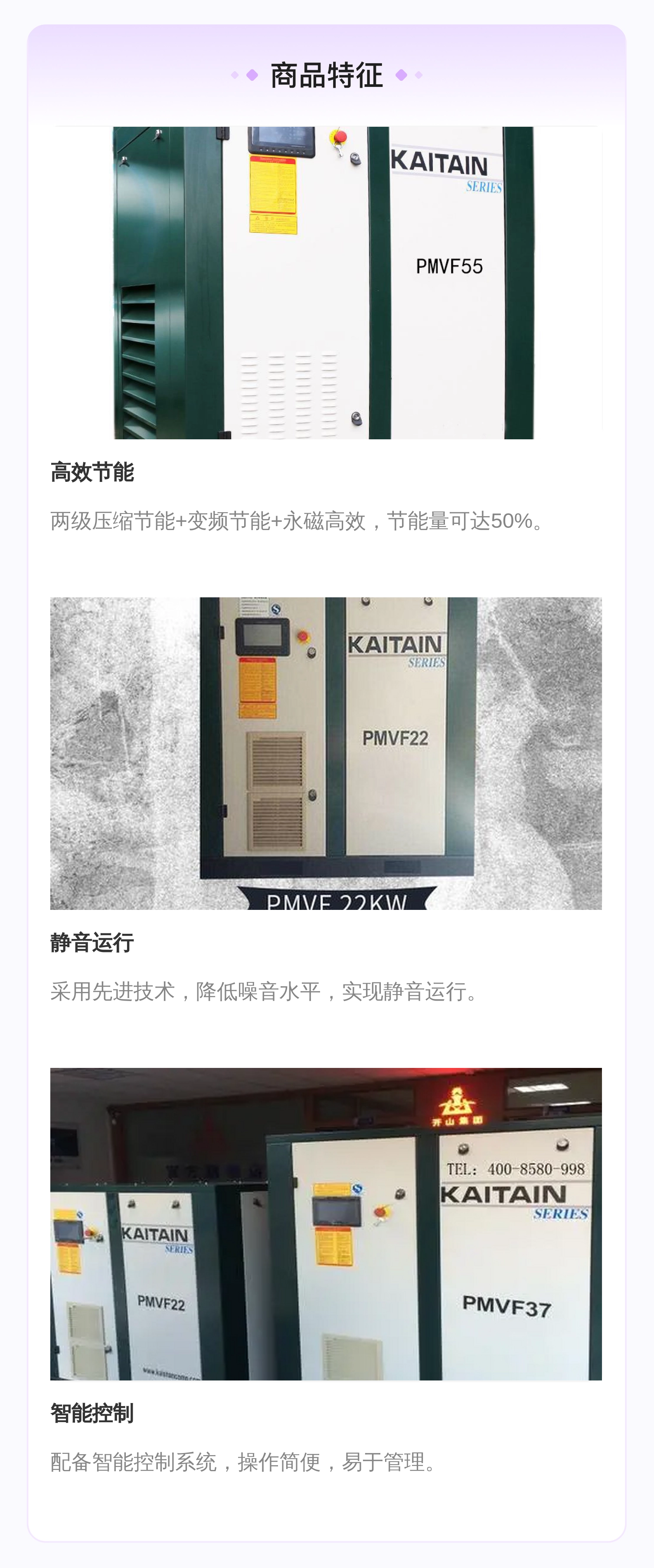 | 节能特性 | 两级压缩节能 变频节能 永磁高效节能 | ||