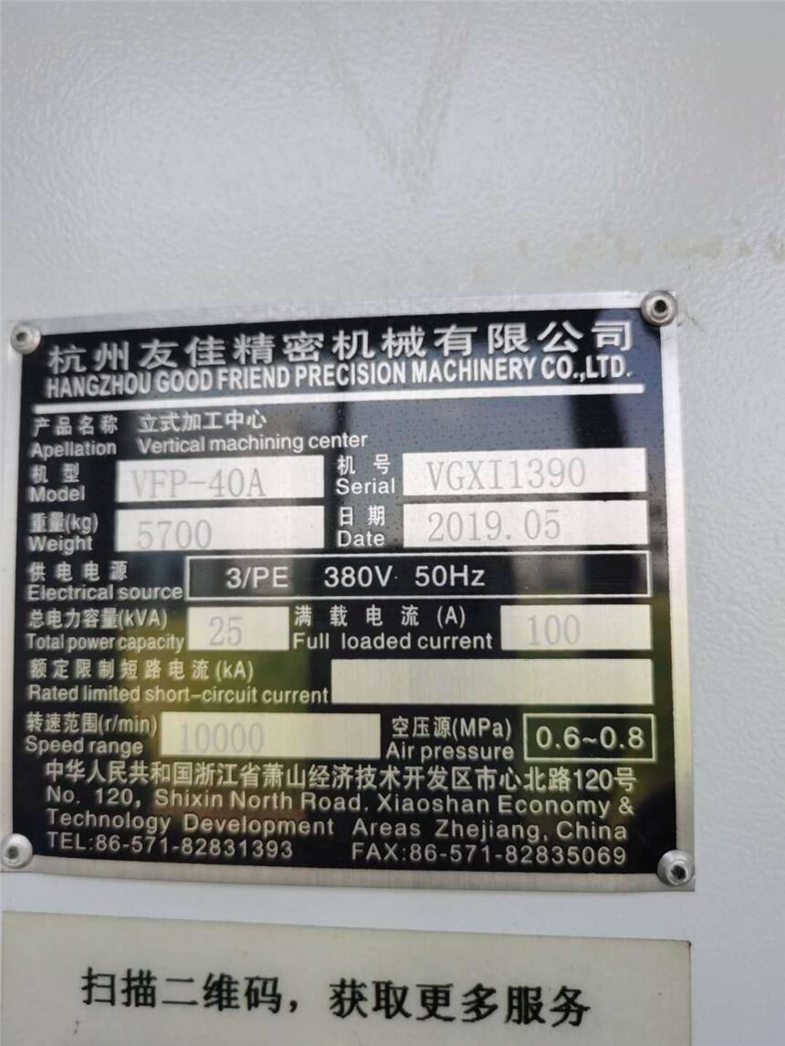 出售全新少用VFP-40A杭州友佳立式加工中心(精密型机器)年份:2019年5月