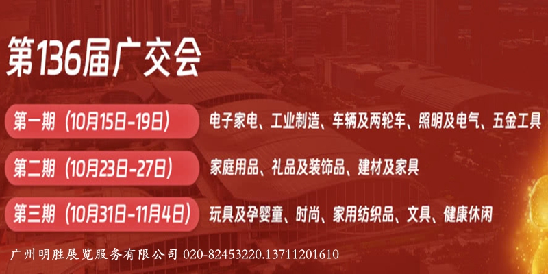 136届广J会开始接收展位预订。每届广J会期间,都有众多参加我公司明胜展览国外展会的客户需求广J会展位。明胜展览现与国内数家交易团及大型外贸公司取得长期合作,为更多需求广J会展位的企业服务。如需广J会摊位、广J会展位、广J会联营展位,请来电咨询。136届广J会明胜展览提供广J会展位如下: