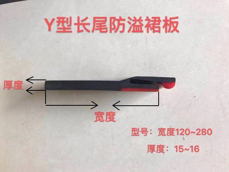 防溢裙板的型号,防溢裙板一般有三类,直板型、Y型与T型,其中直板型防溢裙板为单层密封,Y型与T型防溢裙板为双密封裙板,就密封性能来讲简易选用双密封防溢裙板。客户选购防溢裙板时只需提供防溢裙板的类型及宽度与厚度就可以,与导料槽的型号无关。防溢裙板宽度一般在150-350mm之间,厚度多为15-20,如遇特殊规格我们可临时开模制作,量大从廉。