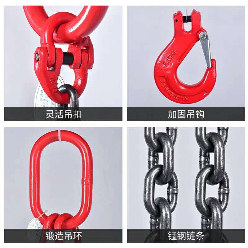 高强度链条索具是以金属链环连接而成的索具,按其形式分主要有焊接和组装两种,按其构造分有单肢和多肢等,采用优质合金钢,其突出特点是耐磨、耐高温、耐腐蚀、延展性低、受力后不会伸长等。其使用寿命长,易弯曲,适用于大规模、频繁使用的场合。灵活的多肢,多种组合形式可提高工作效率、降低成本