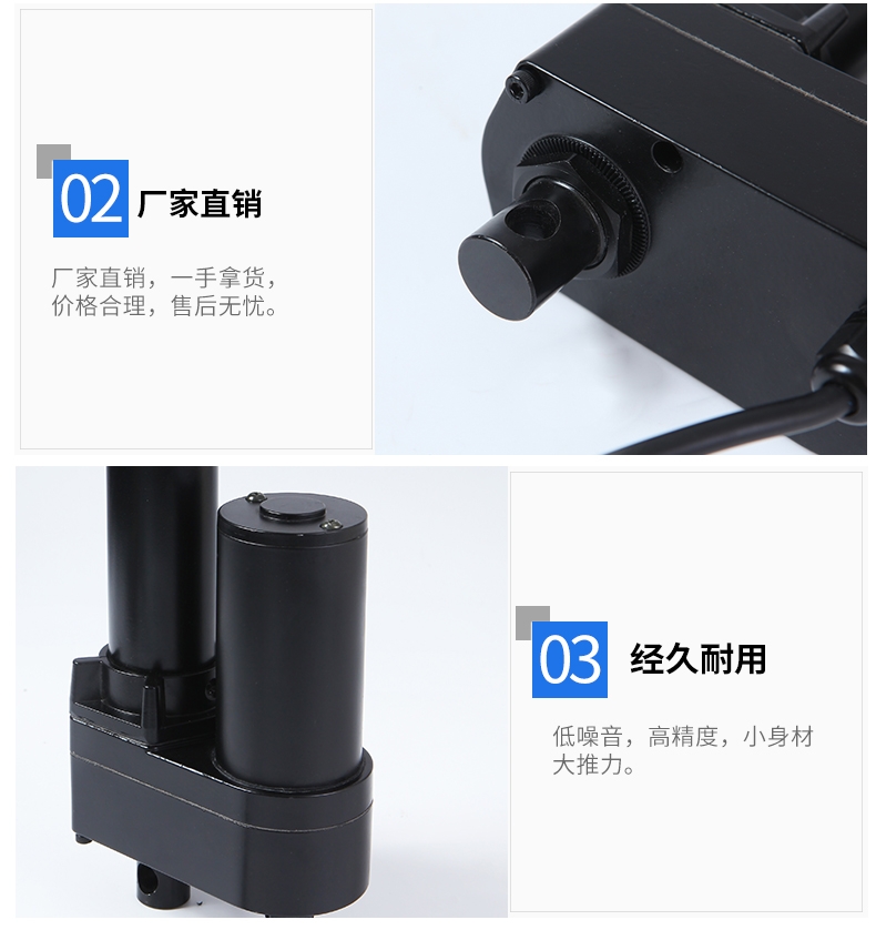 SY-A03A电动推杆电机主要由电动推杆,控制盒、遥控板以及电缆等部件组成.电动推杆可根据配套电机,丝杠和控制装置及行程开关的不同组合可实现升降,倾斜,翻转的功能。由于电动推杆具有体积小,静音设计;而且安全性高,其锁紧力可达推力的十数倍,安全;操作方便,