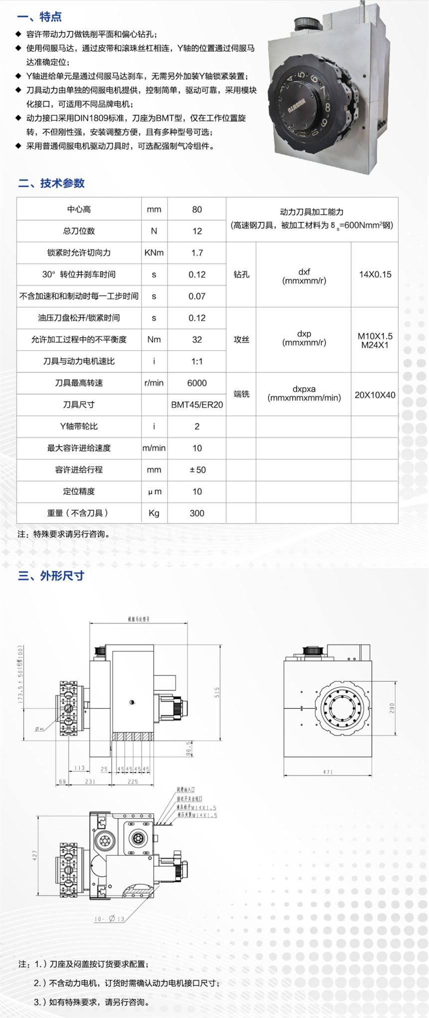 动力接口采用DIN1809标准,刀座为BMT型,仅在工作位置旋转,刚性强,安装调试方便,且有多做型号可选;